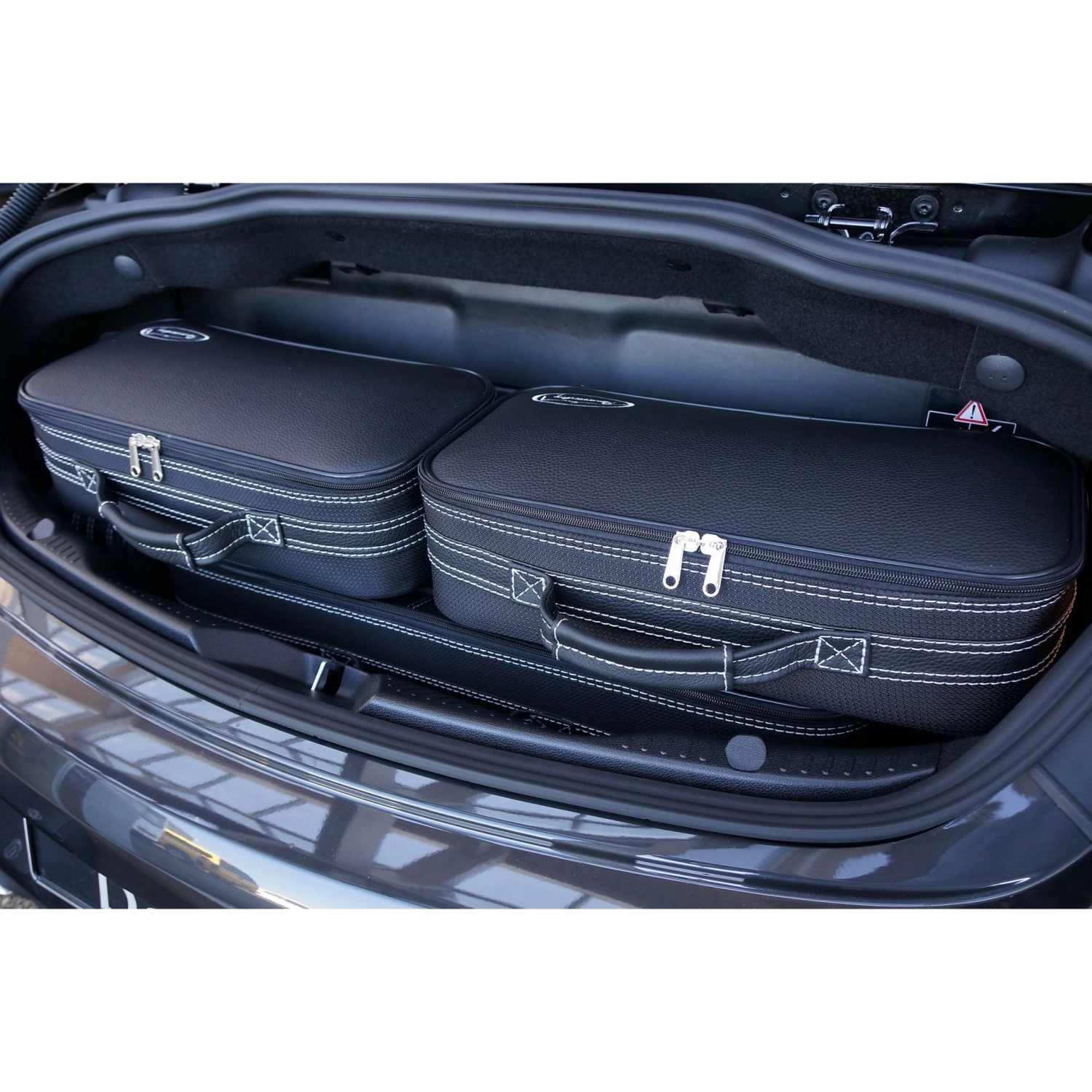 Sie möchtem mit geöffnetem Fahrzeugdach auf Reisen gehen und dabei dennoch nicht am Gepäck sparen? Das edle fünfteilige Kofferset für das Mercedes C-Klasse Cabrio (A205) bietet jede Menge Stauraum und ist perfekt auf Optik und Maße Ihres Wagens ausgelegt. Die beiden geräumigen Trolleys und insgesamt drei passende Zusatzkoffer lassen sich auch außerhalb des Kofferraums komfortabel transportieren – dank bequemer Tragegriffe und einem stabilen Trolley-Rollensystem. Die erstklassige Verarbeitung, handgefertigt in der EU, und ein hochwertiges Innenfutter aus edler Ancarra-Mikrofaser garantieren zudem einen stilsicheren und eleganten Auftritt. Die exakte Passform der Koffer gewährleistet, dass die empfindliche Dachsensorik nicht gestört wird, damit es nicht zu Fehlfunktionen kommt!