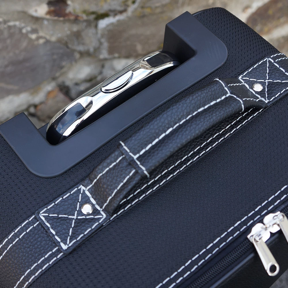 Dieses fünfteilige Kofferset ist die ideale Wahl, wenn Sie mit Ihrem Audi A5 Cabrio gerne Ausflüge mit großem Gepäck unternehmen. Die beiden praktischen Trolleys und drei geräumige Zusatzkoffer passen durch ihr Design perfekt in den Kofferraum Ihres Wagens. Hergestellt aus Markenkunstleder mit einem hochwertigen Innenfutter aus Ancarra®-Mikrofaser und luxuriöser Stickerei sind diese Gepäckstücke optisch absolut gelungen. Ein innovativer Metall-Kunststoff-Verbundrahmen sorgt für die nötige Stabilität. Dank bequemer Tragegriffe und modernem Trolleygestänge lassen sich die Koffer komfortabel transportieren.