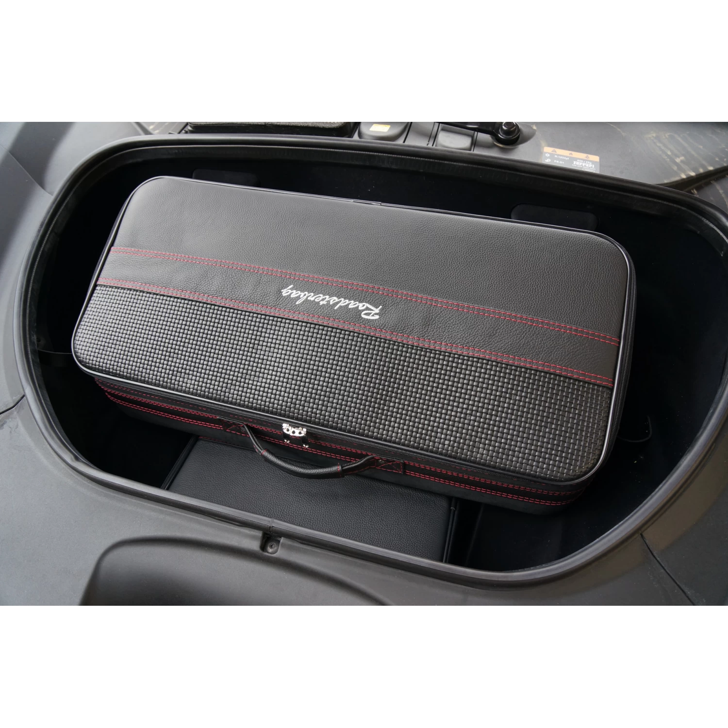 Dieses zweiteilige Kofferset von Roadsterbag ist speziell auf den Kofferraum des Ferrari F8 Tributo und des Ferrari F8 Spider zugeschnitten. Der Trolley und der passende Koffer nutzen den vorhandenen Stauraum optimal aus. Der Trolley ist mit voll versenkbarem Griff, silikongedämpften, verchromten Laufrollen, einer Kugellagerung und Inside-Trolley-Technik aus leichtem Aluminium ausgestattet. Die erstklassige Verarbeitung und das hochwertige Innenfutter aus edler Ancarra-Mikrofaser verleihen dem Set eine edle Optik, die sich nahtlos in das Innendesign Ihres Wagens einfügt. Dank bequemer Tragegriffe lassen sich die Gepäckstücke komfortabel transportieren.