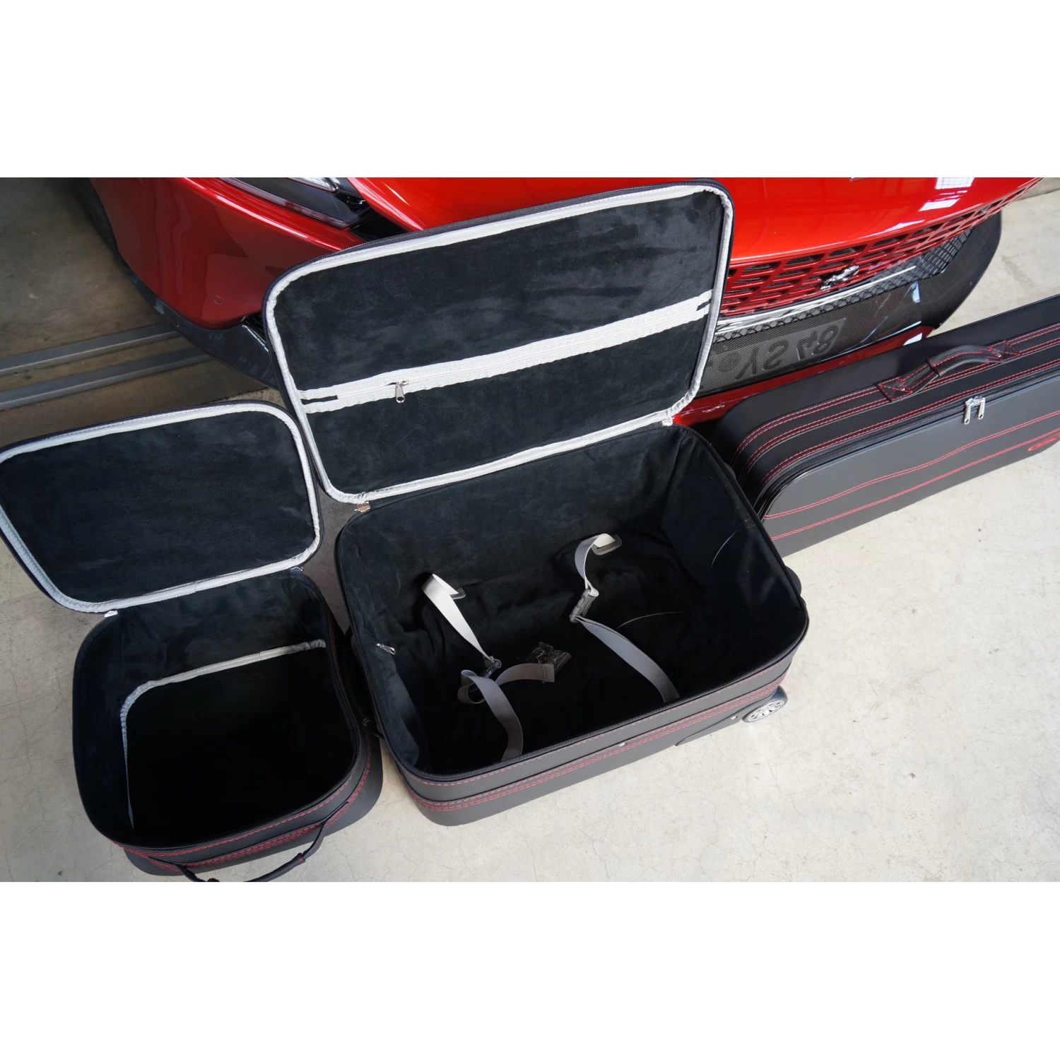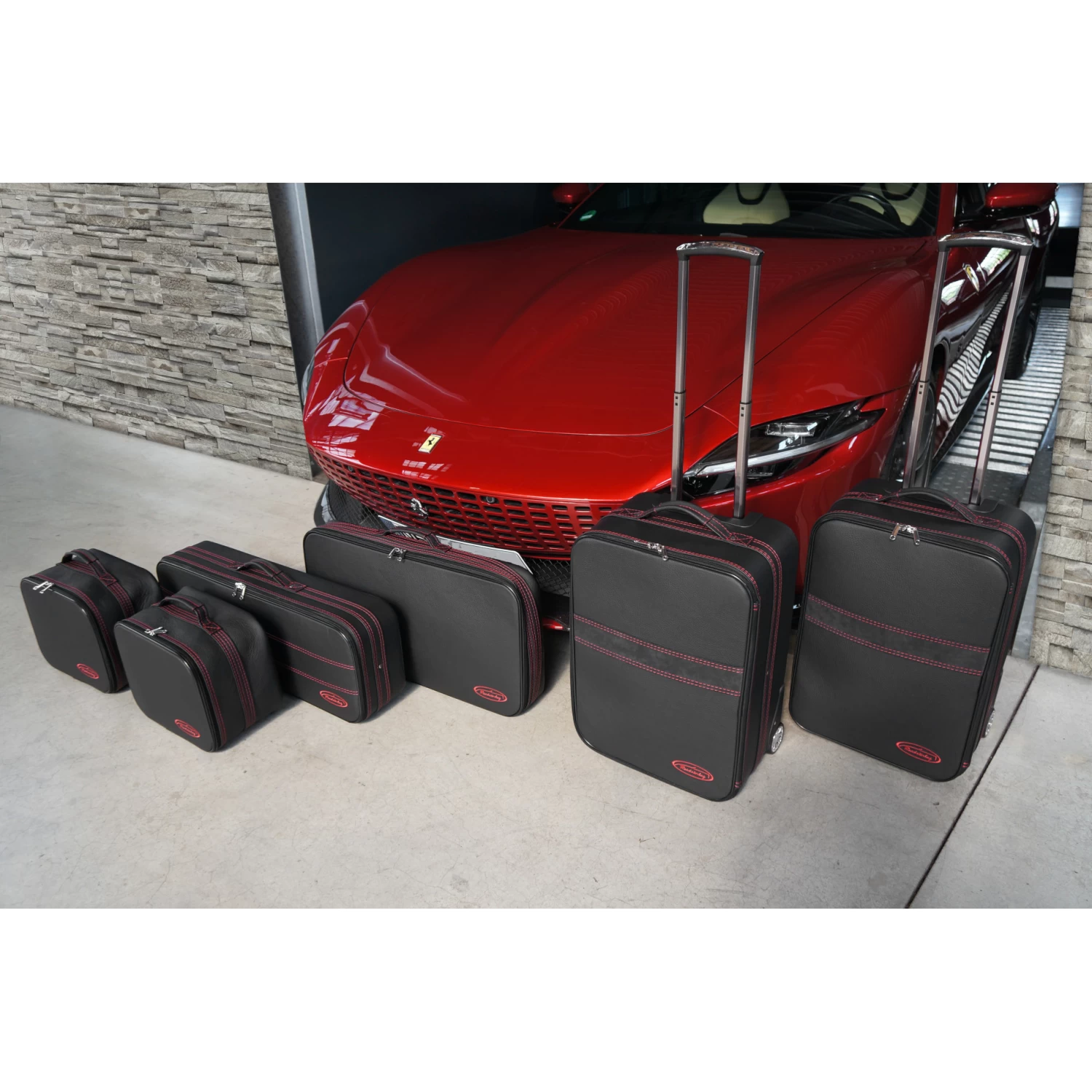 Dieses dreiteilige Kofferset von Roadsterbag ist speziell auf den Kofferraum des Ferrari Roma zugeschnitten. Der Trolley und die passenden Koffer nutzen den vorhandenen Stauraum optimal aus. Der Trolley ist mit voll versenkbarem Griff, silikongedämpften, verchromten Laufrollen, Kugellagerung und Inside-Trolley-Technik aus leichtem Aluminium ausgestattet. Die erstklassige Verarbeitung und das hochwertige Innenfutter aus edler Ancarra-Mikrofaser verleihen dem Set eine edle Optik, die sich nahtlos in das Innendesign Ihres Wagens einfügt. Dank bequemer Tragegriffe lassen sich die Gepäckstücke komfortabel transportieren.